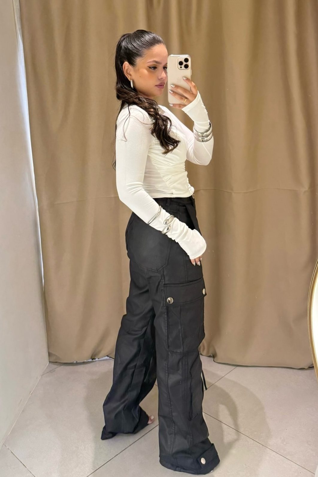 Modelo Duda vestiu tamanho 36, tem 1,59m e 54kg para esse efeito cos baixo.