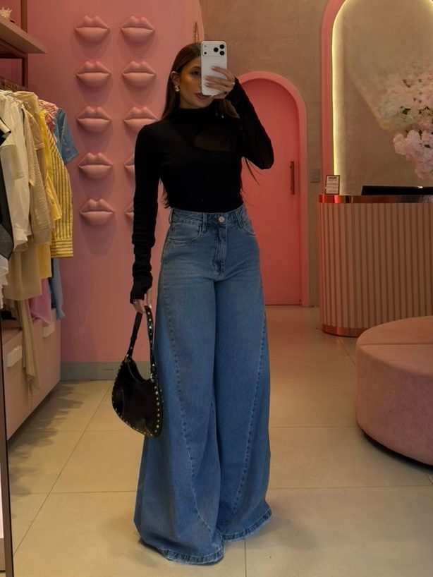 O caimento valoriza a silhueta, alonga as pernas e traz aquele efeito “uau” que transforma até as produções mais básicas. É a peça perfeita para quem gosta de unir estilo urbano com toque glam, funcionando tanto para o dia quanto para a noite.